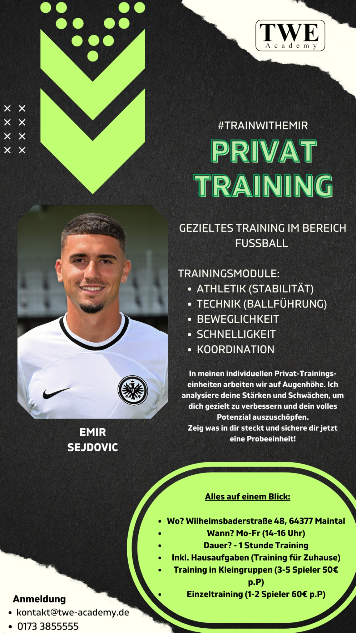 Unter dem Motto #TRAINWITHEMIR legen wir großen Wert darauf, dich dort abzuholen, wo du gerade stehst, und dich Schritt für Schritt besser zu machen. Wir arbeiten dabei auf Augenhöhe und passen unser Training exakt an deine Stärken und Schwächen an. So kannst du gezielt Fortschritte erzielen und deine Leistung auf dem Platz nachhaltig verbessern.